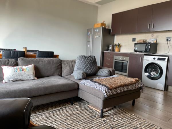 The well-appointed kitchen features ample storage, a pantry cupboard, and accommodates a double-door fridge and one under-counter appliance. The living area opens onto an expansive balcony that stretches the entire length of the apartment, offering breathtaking northern views of the Johannesburg skyline.