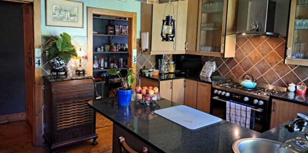 Kitchen: Features a gas stove, granite tops, pantry, wooden floors and scullery. Stunning modern kitchen with granite tops, gas stove, and built-in appliances.