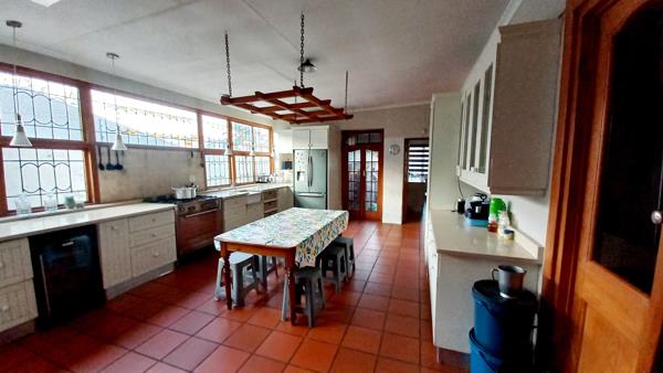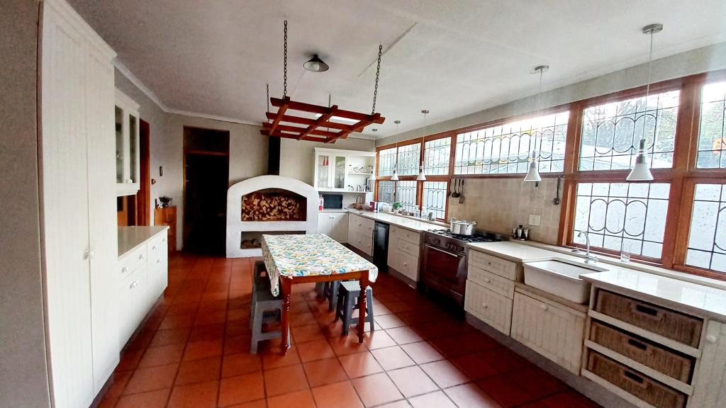 Spacious kitchen with built-in cupboards with lot of space and fireplace.
