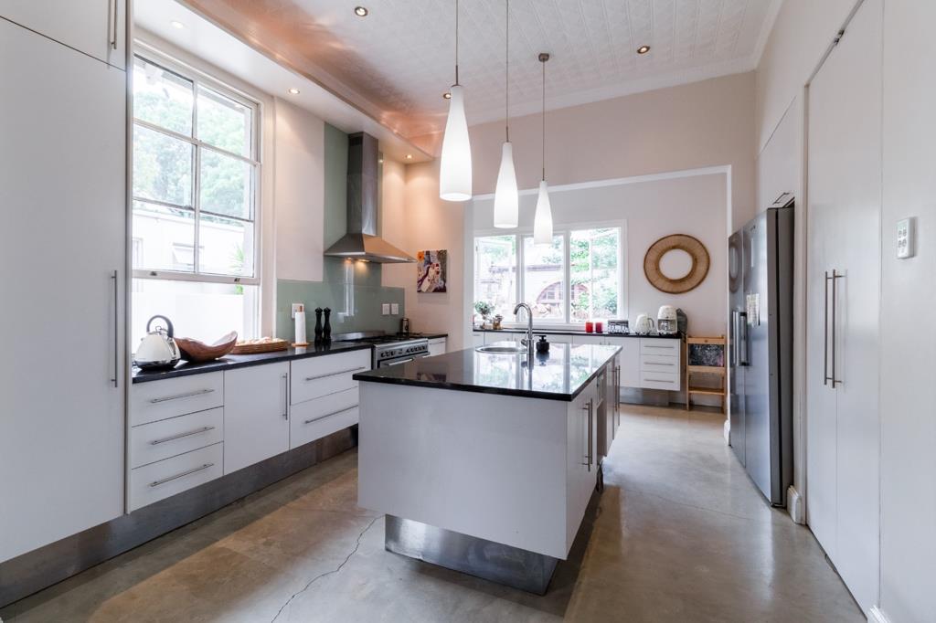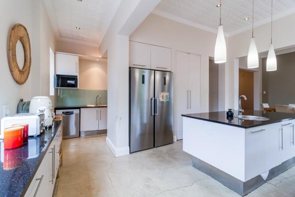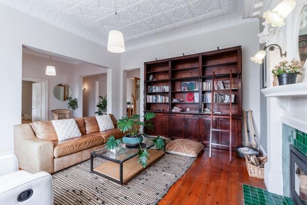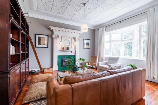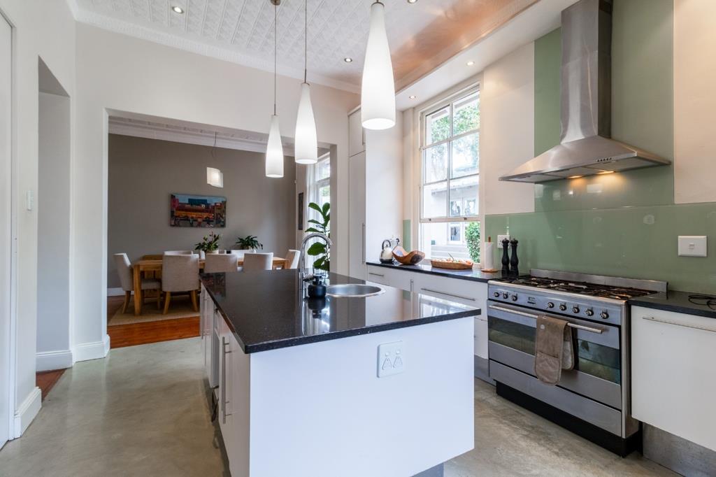 A beautifully renovated space with high pressed ceilings, a modern kitchen, and a cozy layout.