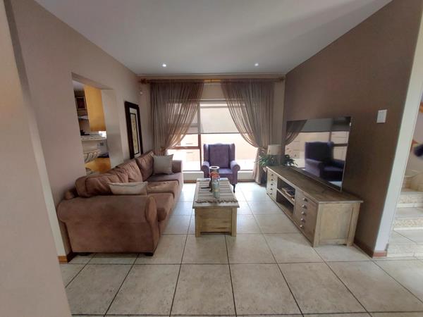 The spacious layout includes a welcoming lounge and separate TV room, ideal for relaxation. A dedicated dining room provides an elegant space for formal meals, while a study offers a quiet area for work or hobbies. The modern kitchen boasts sleek granite countertops, a gas stove, and an oven, perfect for culinary enthusiasts. The warm tiled staircases in a neutral tone, create an inviting atmosphere, making the staircase feel welcoming and leading to the three well-sized bedrooms, including a main en-suite (M.E.S.)and complemented by two modern additional bathrooms and a guest toilet.