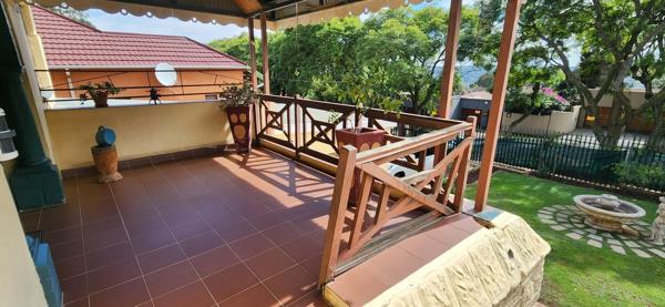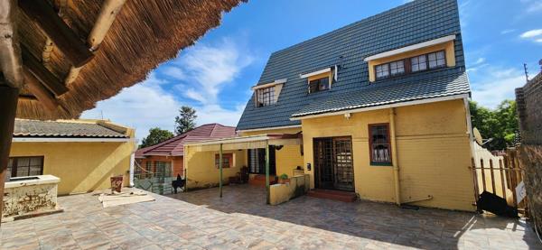 The property consists of a spacious covered patio which leads into the open plan entrance hall and lounge , an open plan dining room and TV lounge which lead out onto a covered patio and a lovely spacious Lapa with built in braai , a fitted kitchen and laundry area plus a guest toilet and basin . Three bedrooms and 2 bathrooms plus a pajama lounge are located on the upper level of the home , The main bedroom has an en-suite full bathroom plus walk in cupboards . The property also has three additional rooms of which one has a toilet , basin and shower . There are 6 rooms in total plus ample space for additional cottages or out buildings to be built on. There are double garages and a workshop or storage area plus ample secure parking for visitors .