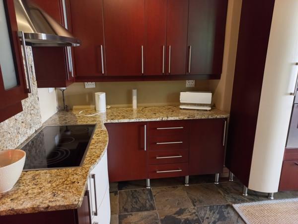 Passageway leading to a well-equipped kitchen with granite countertops, ample cupboard space, extractor fan, built-in microwave, hob & oven, garbage disposal, and adjoining scullery