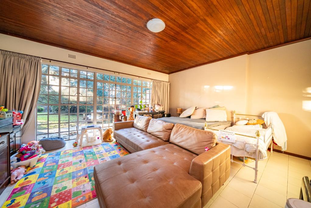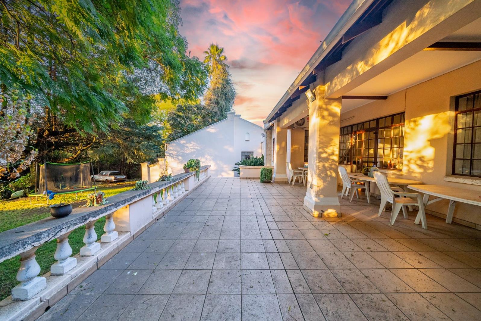 This residence comprises three bedrooms and two and a half bathrooms, catering to family needs. Step outside to an expansive, covered, tiled patio, perfect for outdoor entertaining and relaxation, overlooking a large, mature garden with established trees. The property further benefits from four garages, providing secure parking and additional storage, alongside a separate flatlet for extended family or rental income.
