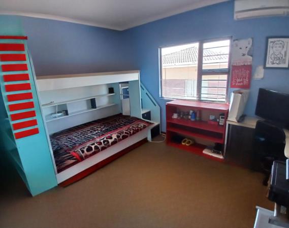 The main bedroom features an en-suite, and the home offers an abundance of living space, including a lounge, TV room, family room, separate dining room, and a dedicated study. The carpeted floors add warmth throughout, while the spacious kitchen is fitted with melamine cupboards, laminate counters, a breakfast nook, and a separate scullery for added convenience. Security is a priority, with gates and trellis doors fitted to all upstairs and downstairs sliding doors.