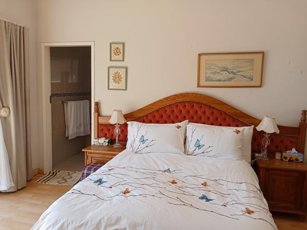 Picture a big stand, commanding sweeping horizon views, with a luxurious all-mod-cons home, plus a cottage. Now lets turn that into reality. May we walk you through it? The magnificent, landscaped garden leads to an immaculate 4-bedroom home with views that will make you feel like an eagle soaring on the wind. Generous living space combines with energy efficiency to put you in command of a palace. Spacious lounge & dining room. Granite-counter kitchen with gas hob. 4 Bedrooms. 2 bathrooms. Solar panels & inverter, gas geysers, plus fibre in the street. Air con. Double garages. Jacuzzi. Cottage. JoJo tank. Youve got it all!