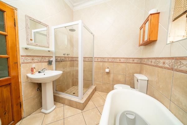 To your left, the cozy lounge features a gas fireplace, perfect for relaxing evenings. The passage leads to three well-sized bedrooms, all with built-in cupboards. The main bedroom is north-facing with a lovely bay window that fills the room with natural light. A full family bathroom includes both a bath and shower, while a second bathroom offers a shower and toilet for added convenience.