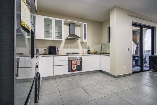 Kitchen descriptionThe kitchen offers sleek white cabinetry, ample storage, and a clean contemporary design