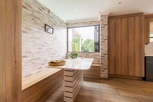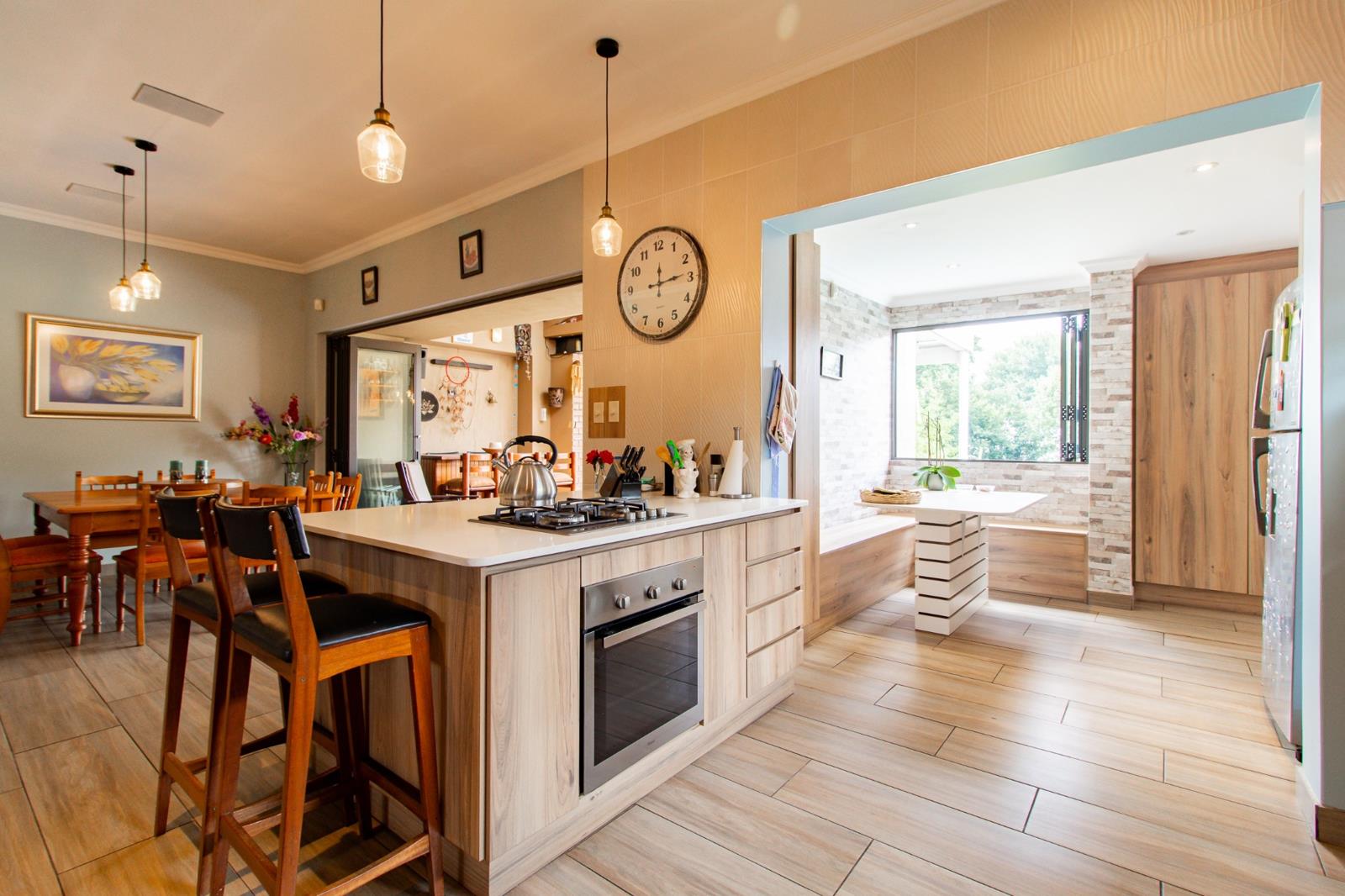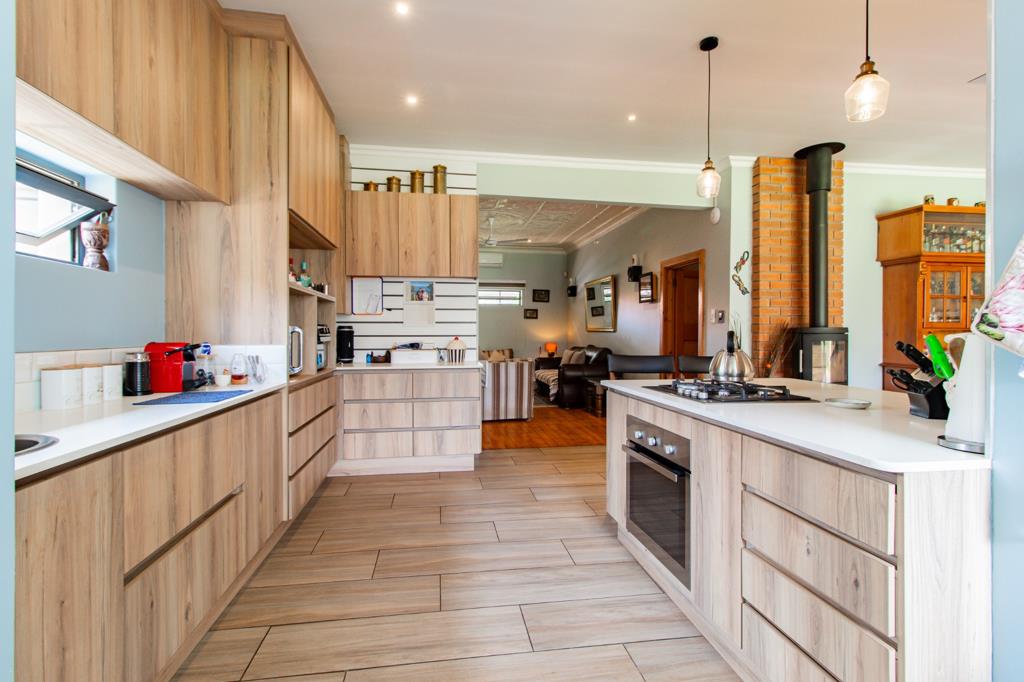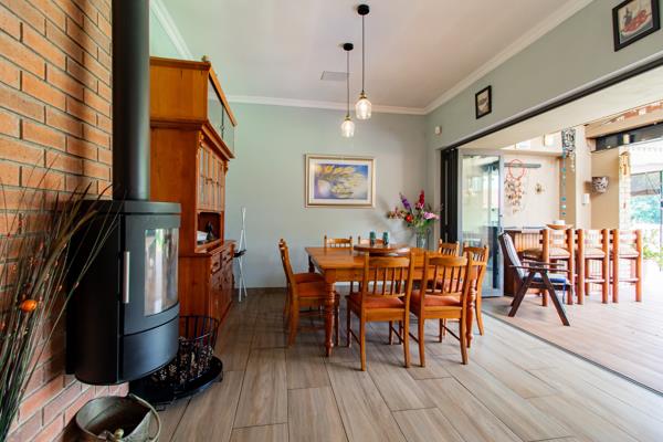 The open-plan living areas flow seamlessly, creating a spacious and inviting atmosphere. The generously sized lounge opens to a stunning, modern kitchen boasting Caesarstone countertops, a gas stove, a water purifying system, and a built-in breakfast nook with a table. A separate scullery, plumbed for three appliances, adds to the convenience. The adjacent dining room, featuring a cozy, modern fireplace, extends via stacking doors to a delightful undercover patio, perfect for al fresco dining. The solar-heated pool beckons just steps away, complemented by a built-in braai area for effortless entertaining.