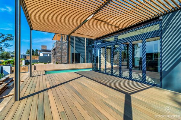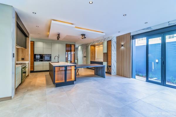 The stackable doors lead out to the decking and pool with a shallow area for sipping cocktails and relaxing. There is an enterainment indoor patio with built-in braai, prep bowel and stunning bar area. Downstairs there is an en-suite guest bedroom, plus a large study area.