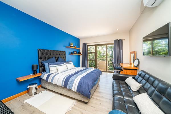 The outdoor living area is a true entertainers dream, featuring a built-in gas braai, integrated speaker system, outdoor bar fridge, and sweeping views over the sparkling pool and lush, irrigated garden, maintained effortlessly by a borehole with full filtration system.
