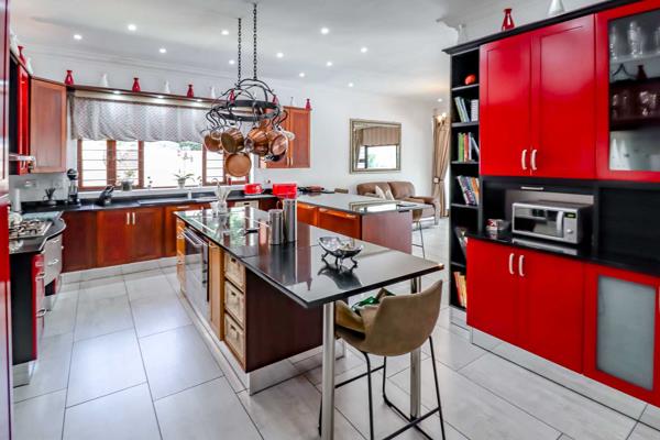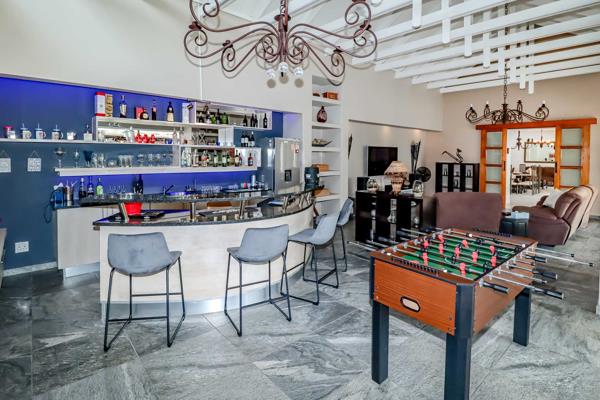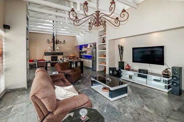 At the heart of the home is an open-plan layout that flows seamlessly from the gourmet kitchencomplete with a separate scullery and laundry areato the dining and spacious living areas. A stylish breakfast bar adds a modern touch, while the family room, with its soaring double-volume ceiling and exposed trusses, serves as a breathtaking focal point. Enhanced by a fireplace, built-in bar, and ambient lighting, this space opens effortlessly onto a large covered patio featuring a built-in braai, bar counter, and ample room for for a full lounge suite and a 12-seater dining table. Overlooking the sparkling pool with its elegant wooden decking and manicured garden, the outdoor area is ideal for hosting unforgettable gatherings.