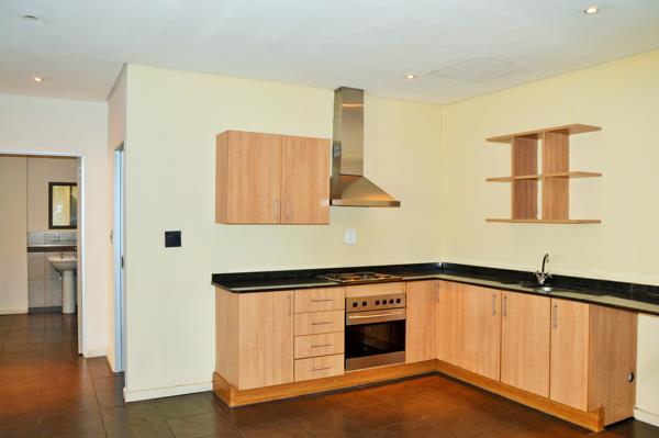 The open-plan kitchen offers ample cupboard space and flows seamlessly into a generously sized living area, large enough to accommodate both a lounge and dining setup. The unit also includes dedicated parking, adding to its convenience.