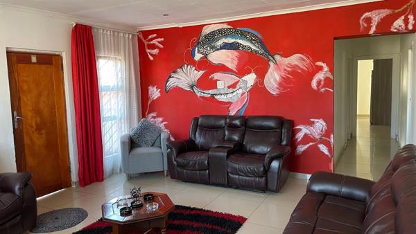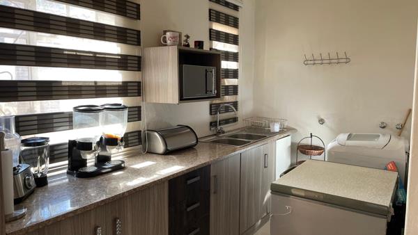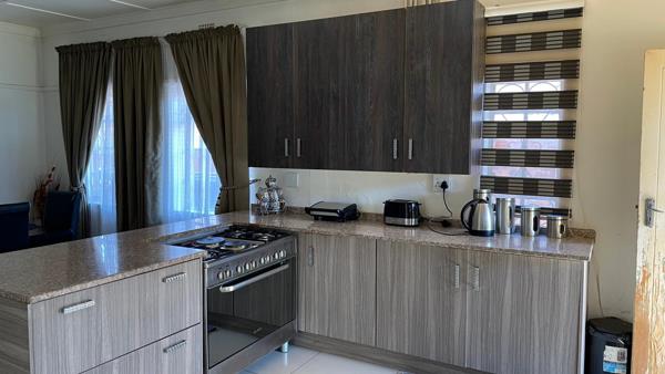 A modern and contemporary open plan kitchen adjacent scullery with granite tops and ample cupboard space where one can be their own master chef, and a seamless flow into the dining area a great space for family meals.