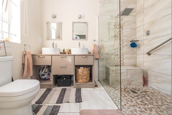 The master bedroom is a sanctuary with laminated flooring and a remodeled, modern walk-in shower bathroom complete with his and hers vanity units, creating a spa-like ensuite experience.