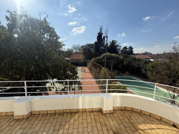 Upstairs, accessed via the majestic staircase, four generously proportioned bedrooms await, including a luxurious master en-suite with two separate bathrooms (one with a shower, one with a bathtub and toilet). Another bedroom, currently used as a study with beautiful wooden shelving and storage, opens to a stunning balcony overlooking the garden, pool, and tennis court, offering potential as a library. An additional bathroom on the passage serves the remaining bedrooms.