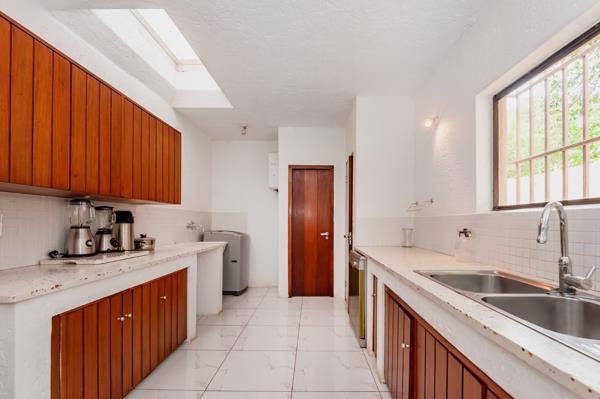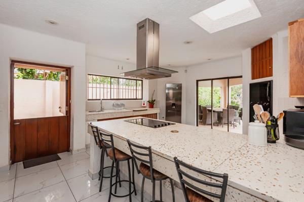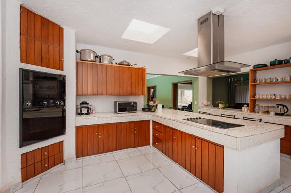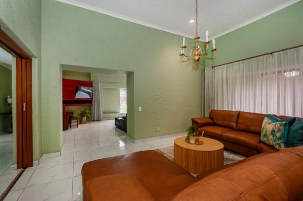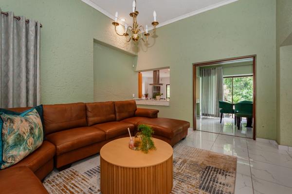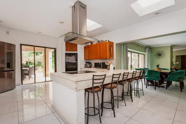 The living areas are exceptional two large lounges open seamlessly to the dining area, which features sliding doors leading to the sparkling pool. The modern open-plan kitchen is equipped with granite countertops, ample built-in cupboards, a pantry, a scullery, and a dishwasher connection. A side door from the kitchen provides easy access to the pool and entertainment area.