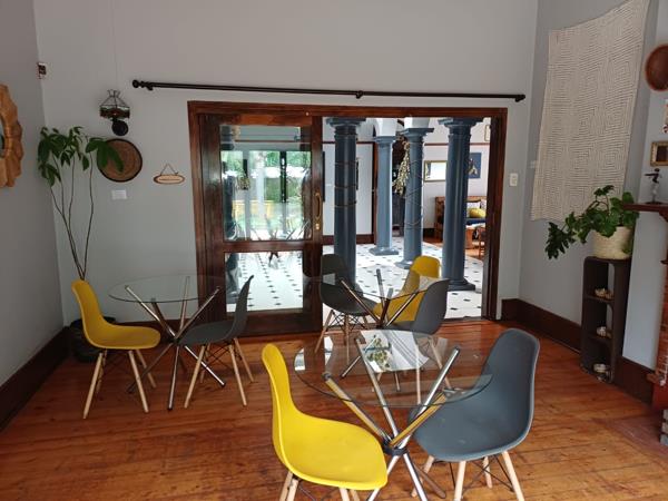 This home has a really easy flow and a lot of personality. You enter into a space that immediately feels lived-in and warm, a library with a fireplace on one side, a work-from-home office on the other, both leading into a central dining atrium that connects naturally to the kitchen. The kitchen leans retro-modern, has a pantry, and even its own CCTV monitor. From there, the house opens up into a sunroom with stacking doors and another fireplace, looking out onto a tidy garden. On the opposite wing is a more formal lounge that steps straight out to the pool area. The main bedroom is generous and private, with its own fireplace, walk-in closet and bathroom, while the remaining bedrooms are well placed for family or guests. Outside, theres plenty going on, from the tennis court to the lapa, pool, and multiple practical outbuildings that make day-to-day living easy.
