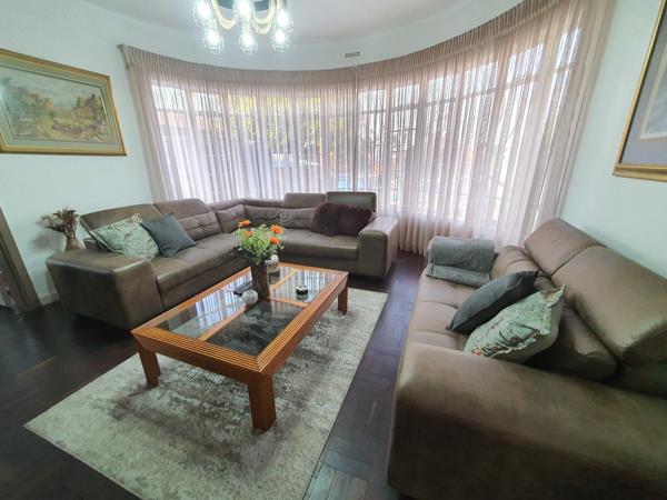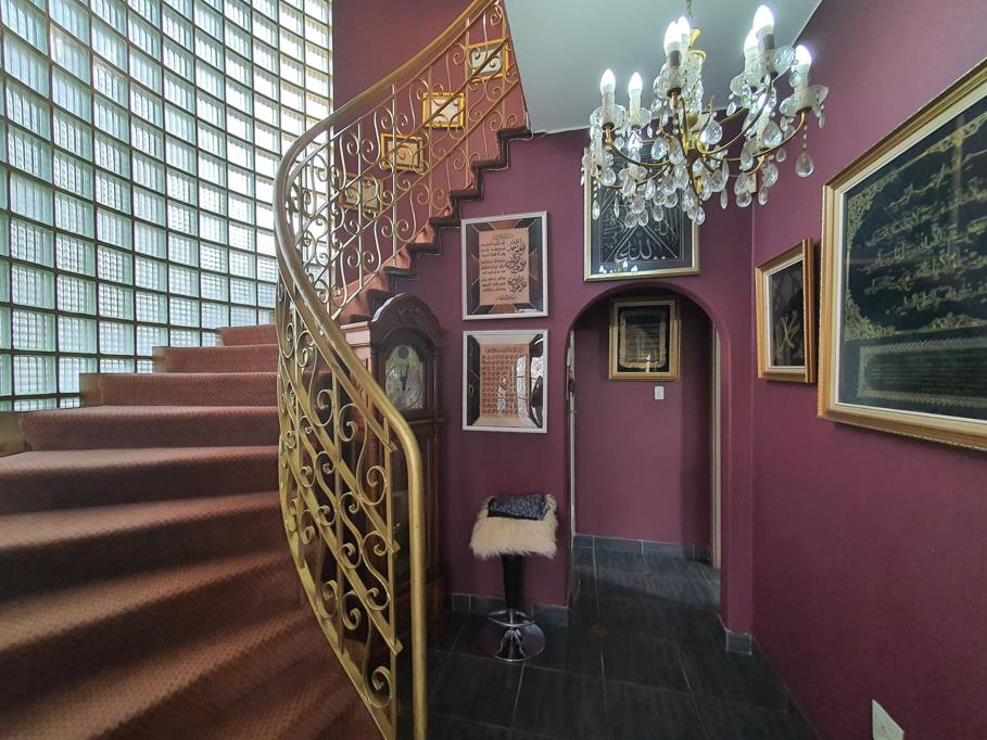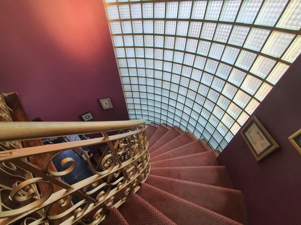 Willing to present offers from R 1 995 000 , owner asking R 2 200 000. This interesting home with its unique rounded glass wall , regal staircase in gold and period chandelier is worth a private viewing . On the ground floor you have a very spacious and airy lounge , leading into the dinging room , both with solid parquet wooden floors. You just want to start cooking when you enter the kitchen . Loads of kitchen cupboards, pantry cupboard, granite counter tops and a separate scullery . Powder room with guest toilet.