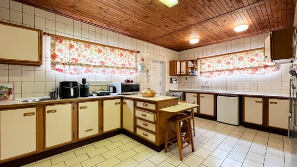 The interior features a functional layout, including a dedicated lounge and dining room, providing distinct areas for relaxation and entertaining. The spacious kitchen is designed with practicality in mind, boasting ample counter space, extensive cabinetry, and an integrated breakfast bar. While currently showcasing a traditional aesthetic with tiled walls, floors, and a warm wood-paneled ceiling, it presents a fantastic opportunity for a contemporary renovation to suit modern tastes. Essential appliances like a built-in oven and extractor hood are present, alongside provisions for a dishwasher and washing machine.