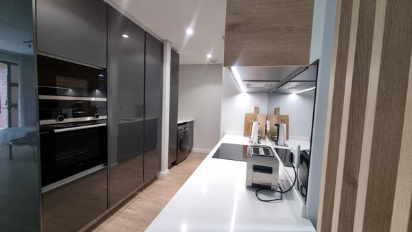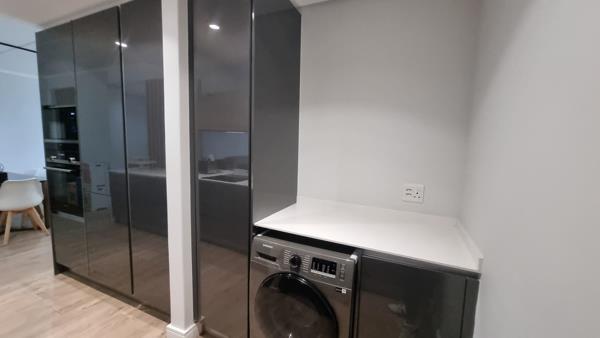 The sleek, modern kitchen features premium quartz countertops, high-end appliances, and stylish contemporary finishes. A convenient separate scullery adds to the kitchen''s practicality.