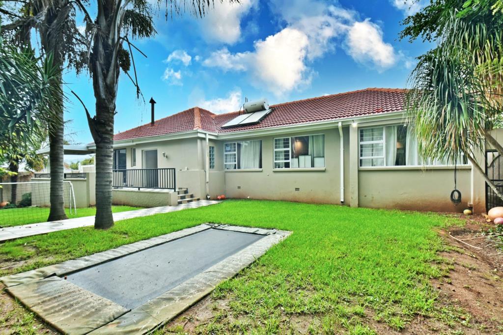 The four bedrooms are generously sized, with the main bedroom featuring a modern en-suite bathroom. The remaining bedrooms are equally comfortable, with plenty of natural light and built-in cupboards. The property''s outdoor spaces are perfect for entertaining or unwinding, with a sparkling pool, braai area, and two patios. Additional features include a convenient laundry room, garage access for two cars, and a charming boma area. Beautiful wooden floors flow throughout the living, dining, and bedrooms, adding warmth and character to the space.