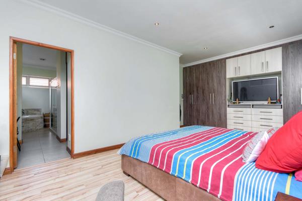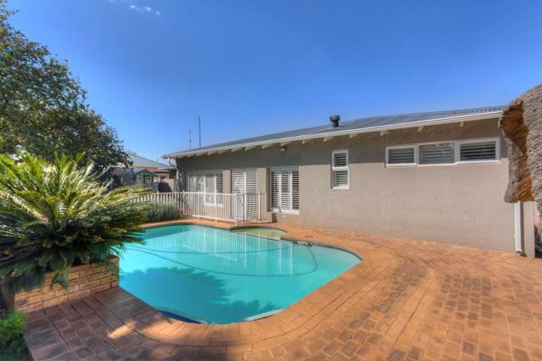 The home features four well-sized bedrooms, each with built-in cupboards, while the main bedroom boasts a luxurious walk-in closet. Two stylish bathrooms include a main en-suite. A large recreation room provides versatile space for a gym, home office, or childrens playroom. American shutters throughout the home add a touch of sophistication. The spacious family room, complete with a built-in braai, extends onto a well-maintained garden and a fenced-off pool area, offering the ideal setting for relaxation and entertainment.