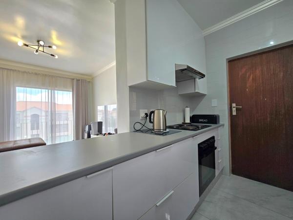 Step into the spacious modern kitchen, fitted with ample cupboard space, high-gloss cabinetry, a 4-plate electric stove, oven, extractor unit, and dedicated spaces for your fridge, microwave, and washing machine. The kitchen flows seamlessly into the open-plan lounge area, ideal for hosting family and guests. Elegant white porcelain tiles run throughout the living spaces, creating a fresh and sophisticated feel.