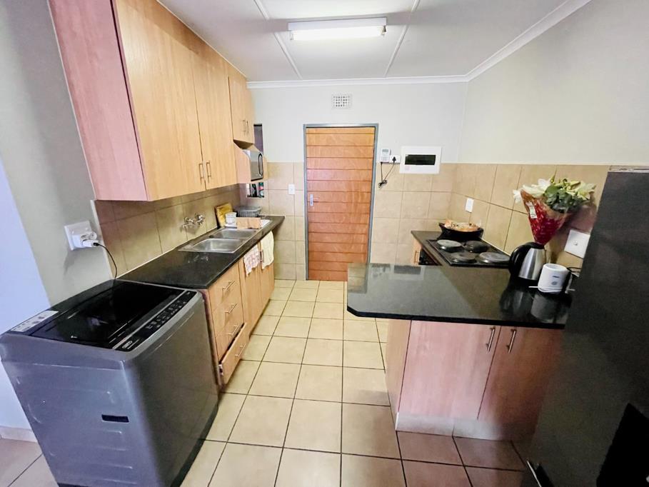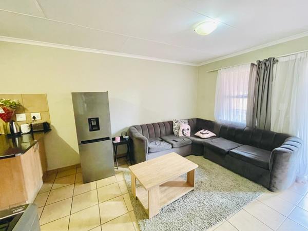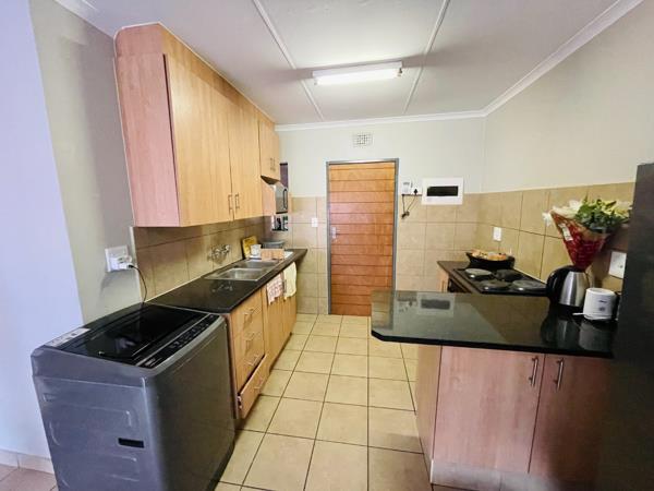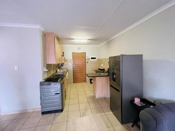A bright and tiled open plan living area flows effortlessly to a private balcony offering views of the well kept grounds and a serene outdoor retreat. The kitchen is fully equipped with an electric stove, oven and sleek granite countertops. It includes contemporary built-in cupboards and space for one appliance. The home boasts two spacious sunlit bedrooms that are tiled and fitted with built in wardrobes for ample storage. A fully tiled and well appointed bathroom blends functionality with comfort.