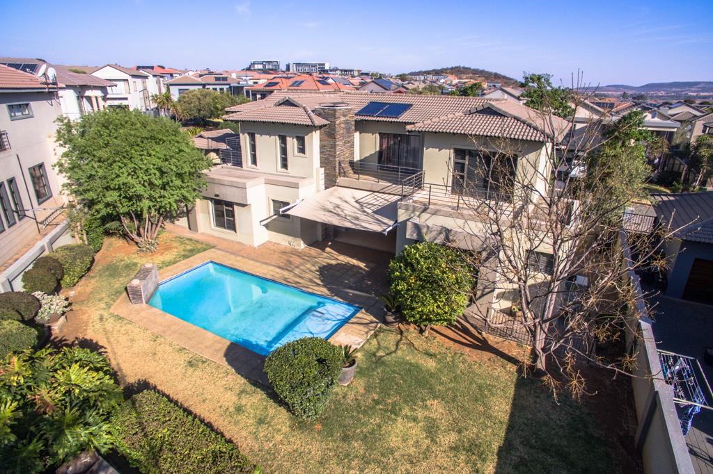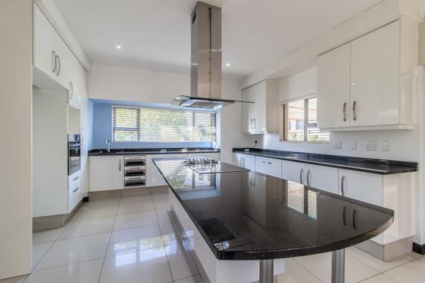 Outdoors, the home invites relaxation and gatherings with a sparkling pool, boma firepit area, and a landscaped garden. Additional features include domestic quarters with bathroom, a double garage, and a carport.