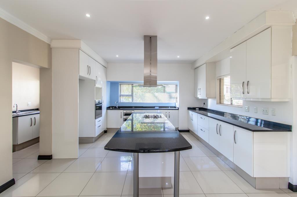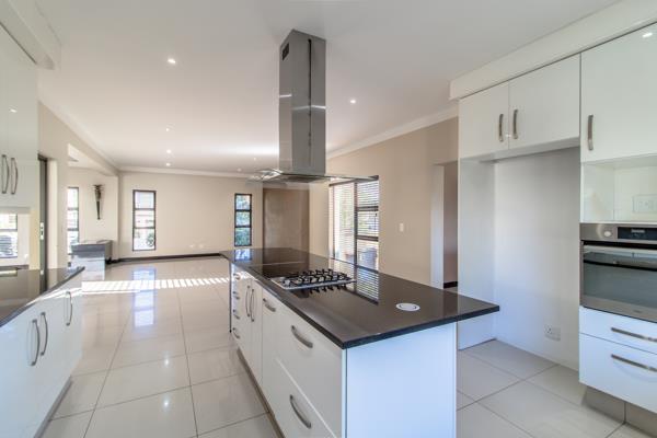 The living areas are designed for both style and functionality, featuring a warm lounge with a gas fireplace, an open-plan dining area, and a modern kitchen fitted with Caesarstone countertops, a gas stove, and a separate scullery for added convenience. The dining space flows seamlessly onto a covered patio with a built-in braai, perfect for entertaining.