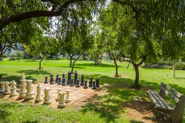 The covered patio with built-in braai and granite tops overlooks a private garden and sparkling poolperfect for entertaining.