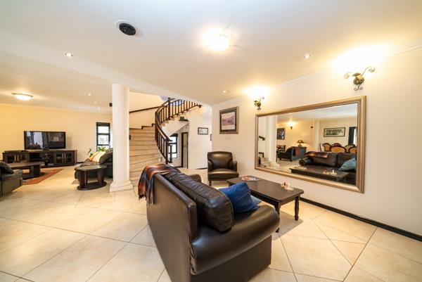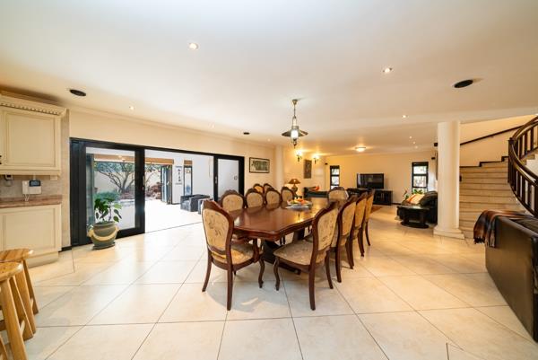 Upstairs, a comfortable pyjama lounge provides a relaxed space for family gatherings, while a linen cupboard offers ample storage. The expansive balcony, with its breathtaking views, is ideal for outdoor dining or simply unwinding in a serene setting. Additionally, a large study offers an excellent work-from-home space or the potential to be converted into a sixth bedroom. The homes impressive entertainment area is a standout feature, complete with a gas stove, wood-burning fireplace, coal braai, and stacking doors that open onto the beautifully landscaped back garden. Here, a sparkling swimming pool and a peaceful koi pond create a private oasis. Practical elements, such as a double garage and staff quarters, ensure all aspects of modern living are met. The consistent use of porcelain tiles and granite worktops throughout enhances the propertys refined aesthetic, creating a cohesive and sophisticated ambiance. Offering a lifestyle of exclusivity and security, this remarkable home in Bassonia Estate must be viewed to be truly appreciated.