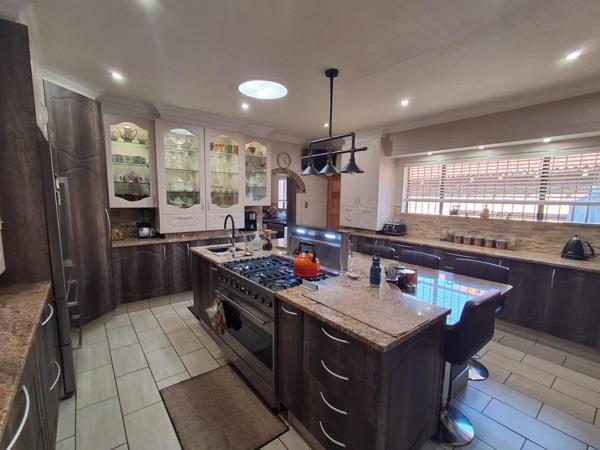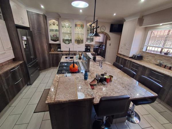 The home has 2 lounges (formal and TV lounge), dining room, study and a huge kitchen - the cook is going to love this kitchen - granite counter tops, island with built-in 6 plate gas stove, breakfast nook, two colour toned cupboards, ample storage space, seperate scullery - space for dishwasher and washing machine - this is what we call a chef''s kitchen.