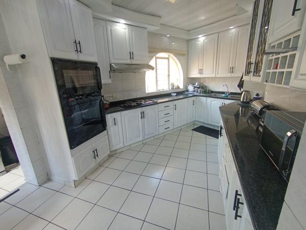 Step inside to find a well appointed interior designed for comfortable family living. The home features two spacious lounges each offering versatile spaces for relaxation and entertainment alongside a dedicated dining area perfect for family meals. Throughout these living zones durable tiled flooring ensures easy maintenance while abundant natural light enhances the airy atmosphere. The heart of the home a U shaped kitchen is both functional and stylish and is equipped with extensive white cabinetry, sleek black granite countertops and integrated appliances including a modern oven, hob and extractor fan. A dedicated utility space efficiently accommodates laundry appliances and a large refrigerator. An expansive entertainment room complete with a pool table and bar seating provides an ideal setting for social gatherings and leisure.