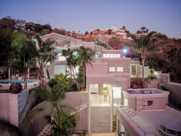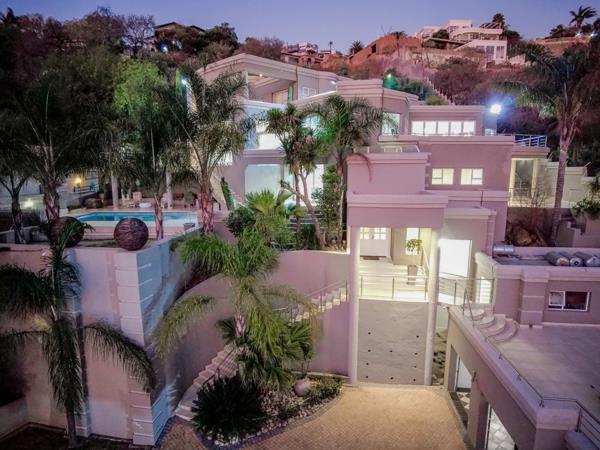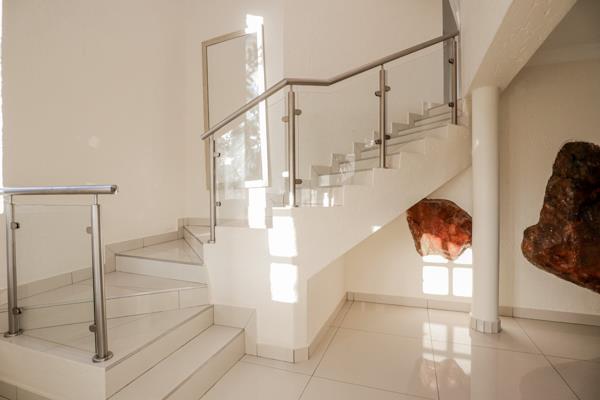 A spiral staircase wraps around a beautifully maintained indigenous garden, leading to imposing wooden double doors. Inside, the reception area boasts double-volume ceilings, tall windows, and skylightsflooding the space with natural light and breathtaking views.
