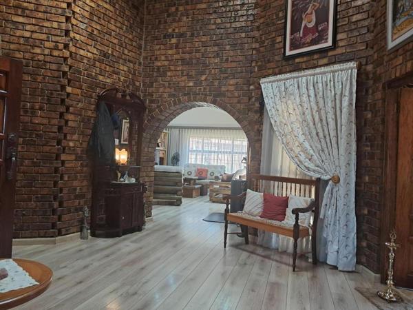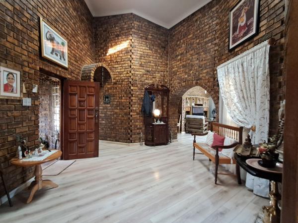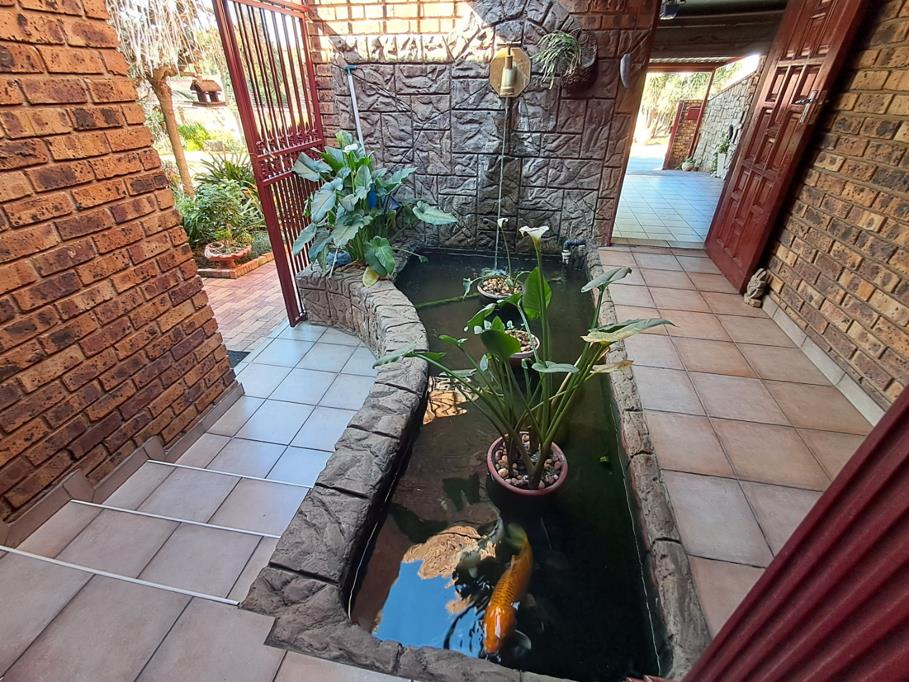 fully tiled walls and floors, spacious scullery with ample built-in cabinetry, dramatic atrium entrance with koi pond andamp modern aluminum fireplace, open-plan lounge and dining areas with laminated flooring, inviting family room leading