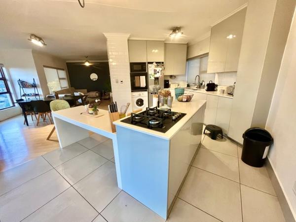 This home features two spacious bedrooms that offer comfortable well sized living spaces fitted with built in wardrobes while the two bathrooms are thoughtfully designed for ease and privacy. A private balcony extends the living area outdoors providing a quiet spot to unwind and take in the scenic views. An open-plan layout seamlessly connects the kitchen, dining and lounge areas creating a welcoming and functional living space. The kitchen stands out with its light toned cabinetry, central island with a hob and built-in appliances including an oven, microwave and washing machine. Generous windows throughout the apartment fill the interior with natural light highlighting the updated light wood flooring and complementing the modern aesthetic.