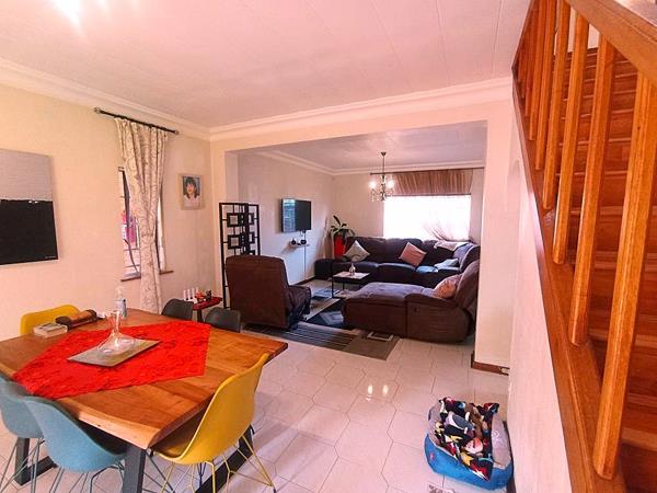 Downstairs, youll find an inviting, open-plan lounge and dining area, elegantly tiled and finished with blinds and ceiling cornices for a touch of refinement. The kitchen is fitted with an under-counter oven, a standard stove, a convenient separate fryer (perfect for preparing delicious samoosas or chips), Formica countertops, and space for a single fridge. A handy under-stair storage area adds extra practicality.