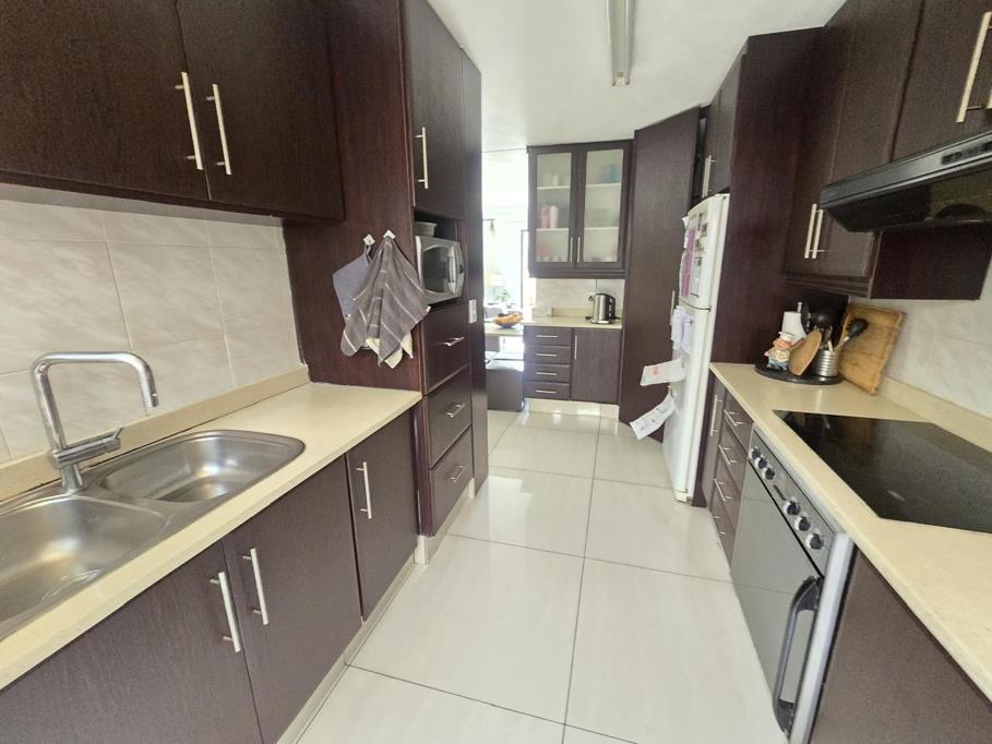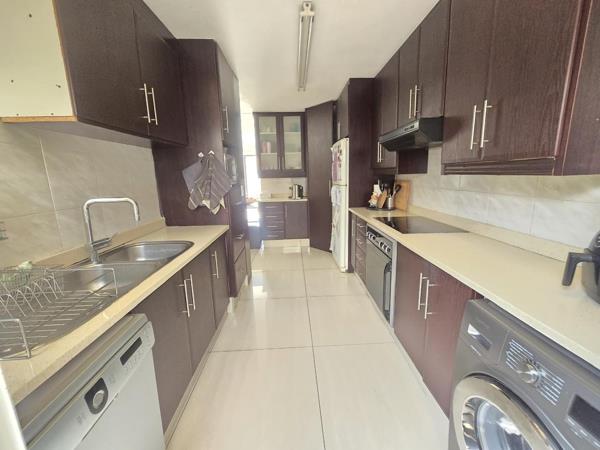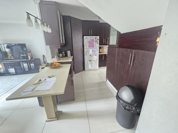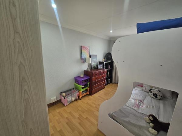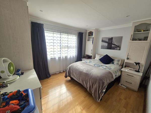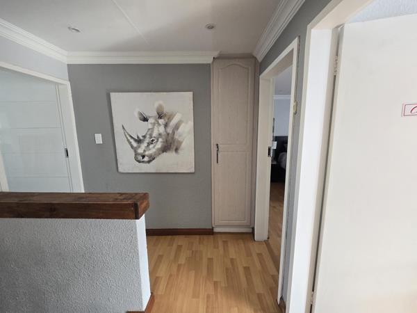 The heart of the home is the modern kitchen, equipped with high-quality appliances, ample cupboard space, and a convenient breakfast nook that leads to a dedicated outside laundry area. Upstairs, a majestic staircase takes you to three generously sized bedrooms with laminated flooring and built-in cupboards. The main bedroom features an en-suite bathroom and walk-in wardrobe, while a second full bathroom serves the remaining two bedrooms. The home also offers an outside room with the potential to be converted into a flatlet, adding extra versatility and value.