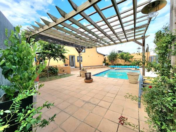The inviting entrance leads into an open-plan living and dining area that flows seamlessly into a modern, fully fitted kitchen, complete with a gas stove for the cooking enthusiast. A spacious lounge creates the ideal space for family gatherings, while the patio overlooking the garden and swimming pool provides the perfect setting for outdoor entertainment.