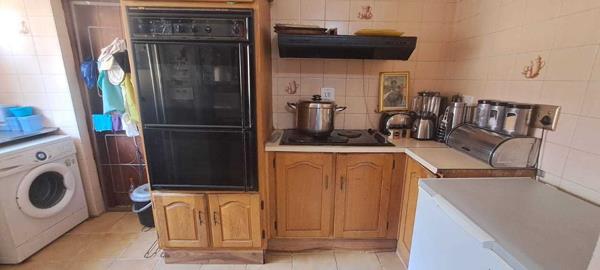 The home includes a tiled lounge with a cosy bar nook, a dining room currently used as a TV room, and a well-appointed kitchen with double eye-level oven, electric hob with extractor, and space for a front-loader washing machine. A linen cupboard adds extra storage convenience.