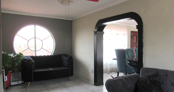 The home presents a welcoming kerb appeal with its durable brick exterior and tiled roof, complemented by a paved driveway providing off-street parking. Enhanced security features include window bars and a security gate, while a distinctive circular window adds unique architectural character to the facade. Inside, the living spaces are designed for modern living, featuring an open-plan layout that benefits from abundant natural light. The lounge area boasts a stylish wall-mounted media unit with integrated lighting and a large, comfortable tufted sectional sofa, all set on durable tiled flooring. Arched entryways create a seamless flow into the dining area, which is equipped with a contemporary glass-top dining table and striking teal velvet chairs, perfect for entertaining.