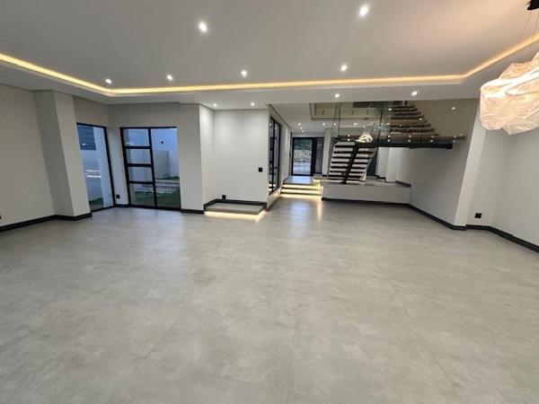 Step inside to an expansive open-plan interior, where natural light floods through vast glass doors, illuminating the pristine tiled floors and neutral palette. The heart of this home boasts three opulent lounges and a dedicated dining area, seamlessly flowing into one another. A magnificent floating staircase with a glass railing serves as a sculptural focal point, enhancing the home''s contemporary allure and inviting exploration of its upper echelons.