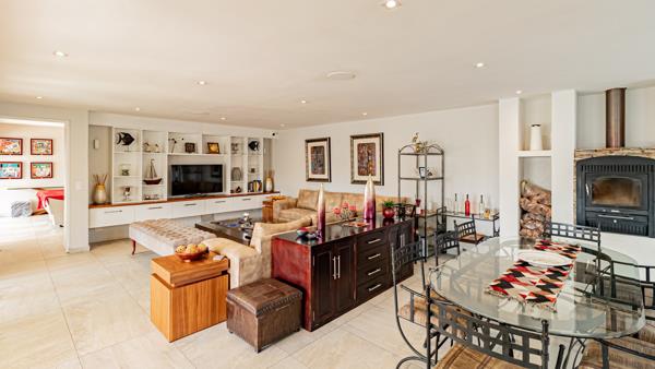 Entertain your guests in the bar which features a guest toilet and leads out to stacking glass doors onto the 100 square meter patio with built in braai. Cool off in the sparkling pool with water feature and garden area.