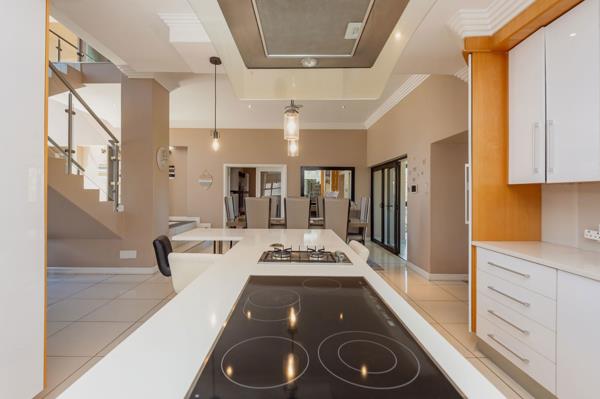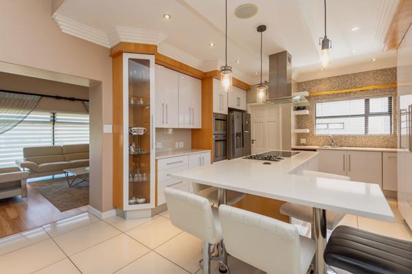 Unpretentious Charm. This ultra-modern and immaculate double story home overlooks the fairway with breath taking sunsets and exquisite mountain views from the pool deck and bedroom balcony well located next to a park. This spacious 5 bedroom masterpiece with 4 living areas, your own chic bar, study, double volume grand entrance and open plan gourmet kitchen is any entertainers delight. This home offers excellent finishes, and well maintained. Double garages, staff accommodation, storeroom, solar geyser, and prepaid electricity.