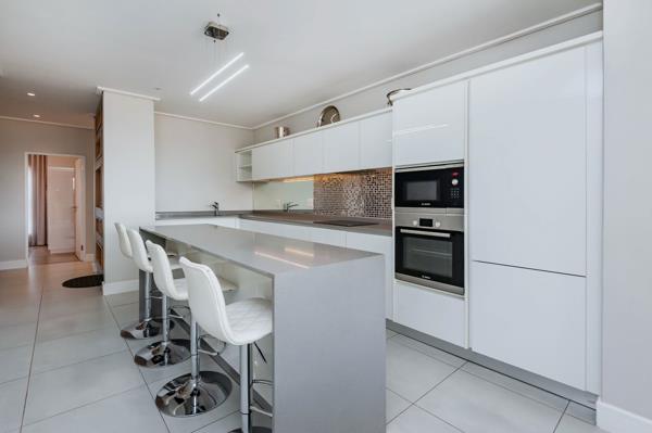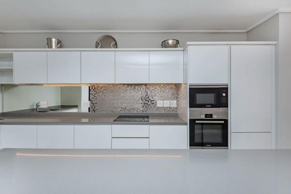 Designer Kitchen High-gloss cabinetry, Caesarstone countertops, and premium Bosch appliances: glass hob, electric oven, built-in microwave, dishwasher, and washerdryer.