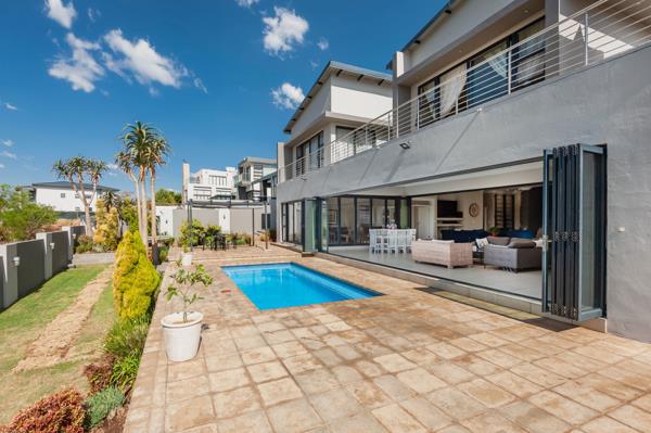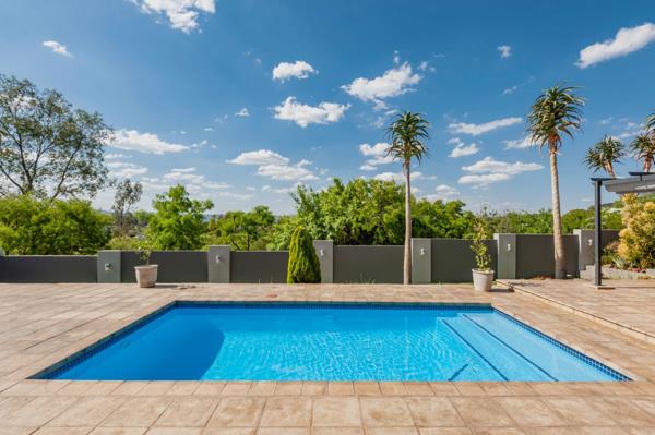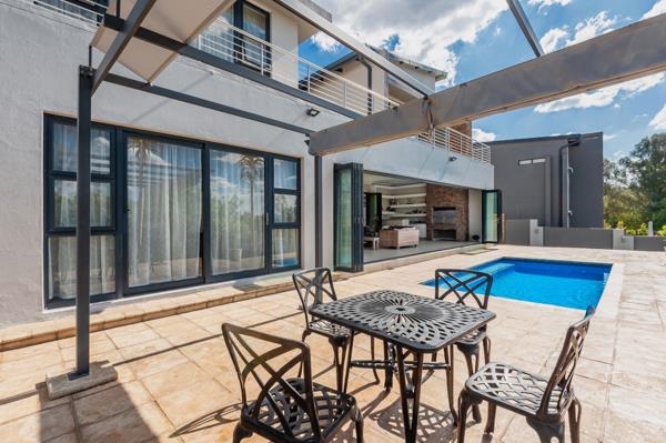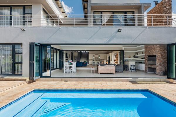A grand double-volume entrance with a central staircase sets the tone for the spacious and light-filled interiors. Expansive formal living and dining rooms, each with their Chad-O-Chef gas fireplace, provide elegant spaces for entertaining. Flowing seamlessly from these areas are covered patios with stable-style doors that open directly onto the large, landscaped garden. At the heart of the outdoor space lies a large sparkling pool, perfect for relaxation, entertaining, or enjoying the sunshine with family and friends. The outdoor area also features a built-in braai and bar, creating the ultimate entertainers setting.