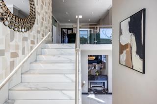 Step outside to a covered patio equipped with a built-in braai and projector system, leading to a beautifully landscaped garden. The garden features a sunken fire pit and a sparkling pool, perfect for indoor-outdoor entertaining.