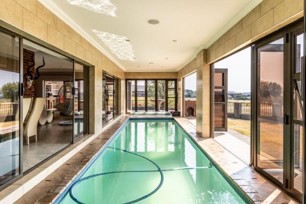 To the west, an indoor swimming pool brings year-round leisure and sophistication, while a second entertainment lounge extends seamlessly toward the golf course, perfect for sundowners, gatherings, and weekend celebrations.
